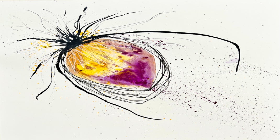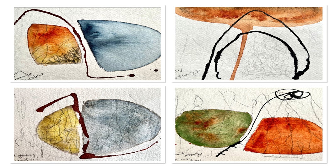 One of the recurring forms in my work is what I’ve come to call the 'Evolution of the Pod'. These soft, organic shapes often suspended in white space emerged from experiments with ink and natural pigment. They’re a quieter part of my practice, but they carry just as much emotion. Where the layered abstracts are dense and loud, the pods are contemplative, almost meditative. They speak more to growth, fragility, and transformation. I intend furthering this investigation using inks made from natural hedgerow ingredients.