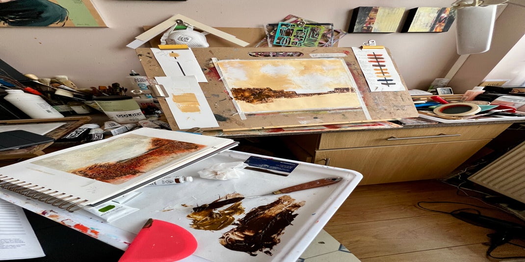 There’s something really enjoyable about working with cold wax and oil paint on a landscape. It’s all about texture and surface, dragging a palette knife through those warm browns and ochres, softening the edges with a creamy mix of wax and pigment, and watching a horizon slowly appear on the taped square on the easel.