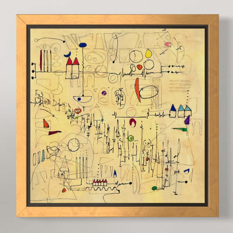Three irregular forms drift across a warm field of ochre and muted green, like fragments of an unfinished system. One red, fractured circle pulses with energy while the others remain pale and tentative. Beneath them, faint diagrammatic marks ans asemic writing suggest abandoned plans or forgotten schematics, an abstract meditation on improvisation and the beauty of emergence without design.